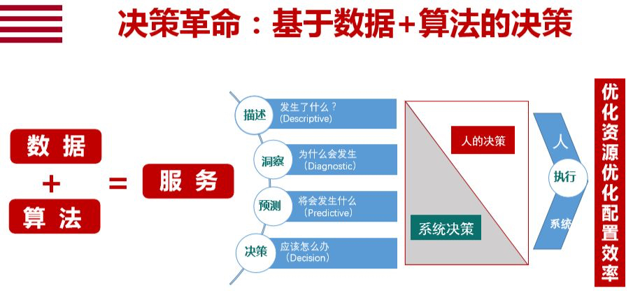 决策革命简而言之就是基于数据+算法的决策。“数据+算法=服务”实现分四个环节:一是描述,在虚拟世界描述物理世界发生了什么;二是洞察,为什么会发生,事物产生的原因;三是预测,研判将来会发生什么;四是决策,最后应该怎么办,提供解决方案。