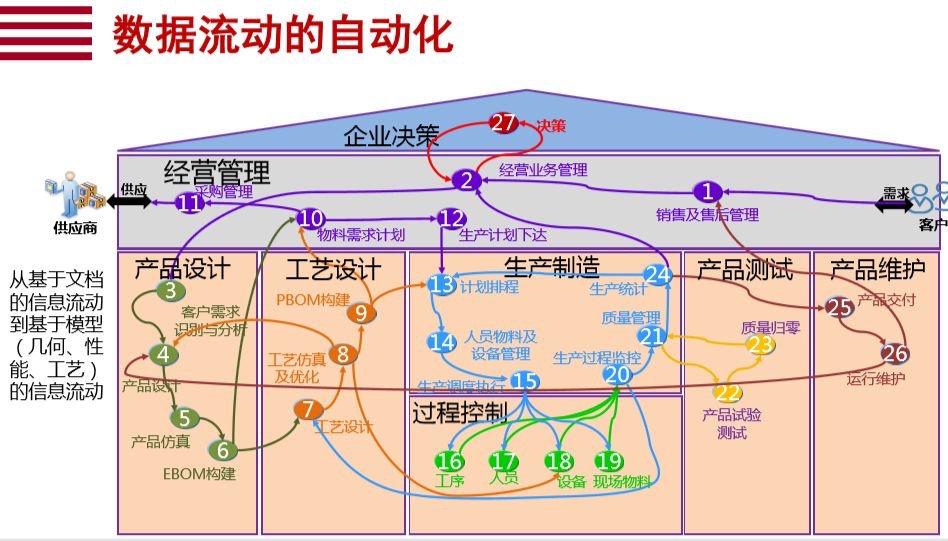 我们把这一模式概念拓展到一般生产场景,当企业采集了客户的数据之后,这些数据就会在企业经营管理、产品设计、工艺设计、生产制造、过程控制、产品测试的每一个环节里去流动。我们要思考的问题是在数据流动的每一个环节,是不是可以没有人去参与。过去信息的流动是基于文档的流动,我们的企业通过传真、e-mail、excel表、U盘、光盘、打电话、开会、自己开发工艺程序、编写软件等各种方式传递信息。今天,我们所要追求的是,数据能够在企业内部流动过程中,不需要人的参与就可以实现信息的自动流动。