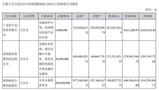 从财报数据来看,上述两家公司经营状况并不乐观。赫美智科2018年营业收入2.72亿元,营业利润亏损2.79亿元,净利润亏损2.39亿元;赫美小贷营业收入1.99亿元,营业利润亏损6.96亿元,净利润亏损5.18亿元。此外,两家公司净资产也均为负,分别为-4066.98万元、-2.57亿元。