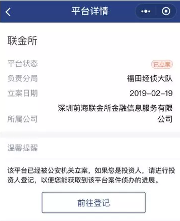 年报信息显示,深圳市公安局福田分局2019年2月19日对深圳前海联金所金融信息服务有限公司涉嫌非法吸收公众存款案立案侦查。查询深圳经侦互联网金融平台投资人报案登记系统发现,前海联金所平台状态同样显示为已立案,投资人可通过该平台进行登记。