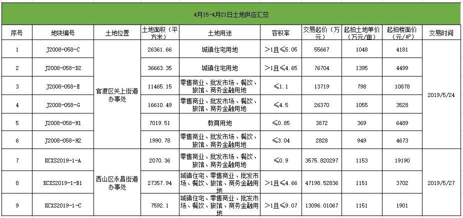 根据昆明市国土资源局数据统计,上周昆明供应9宗土地,供应面积约205.53亩,交易起价约24.3亿元。位于官渡区关坡片区的150亩土地将打包成1个地块出让,起拍金额约17.9亿元,土地单价367.8-1407.8万元/亩,起拍楼面价3527.9-10878元/㎡。该批土地属于官渡区关坡片区城改项目二期用地,毗邻巫家坝片区,将于5月24日挂牌交易。