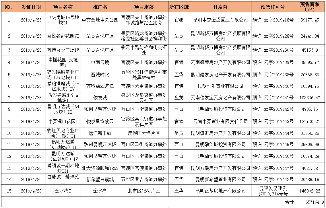 据昆明市房产信息网数据显示,上周昆明主城四区和呈贡共有12个项目获得15张预售证,新增预售面积约66万方,相比前一周12项目35万㎡的增量,新增预售面积大幅提升,涨幅将近47%。其中,4月25、26两天之内,昆明主城五区共发放13张预售证,新增预售面积约40万方。从如此大的供应量来看,昆明楼市或将于5月迎来开盘热潮。