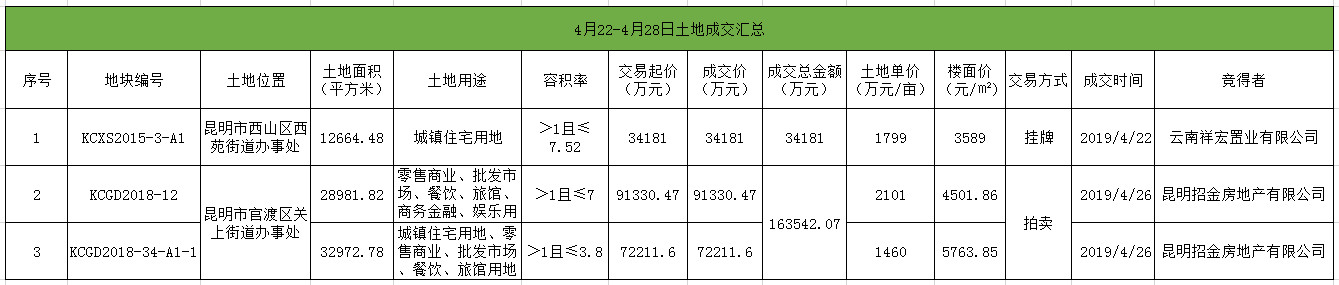 据界面楼市统计,上周昆明一共成交3宗土地,成交面积111.93亩,成交金额约19.77亿元。其中位于西山区西苑街道办事处的一宗19亩纯住宅用地,被光大集团控股的云南祥宏置业有限公司以底价34181万元获得,土地单价1799万元/亩,楼面价3589元/㎡。另外两宗位于官渡区关上街道办事处的住宅兼商业用地,被招商局集团旗下昆明招金房地产有限公司以底价约16.35亿竞得,土地单价约1460-2101万元/亩,楼面价约4502-5763元/㎡。