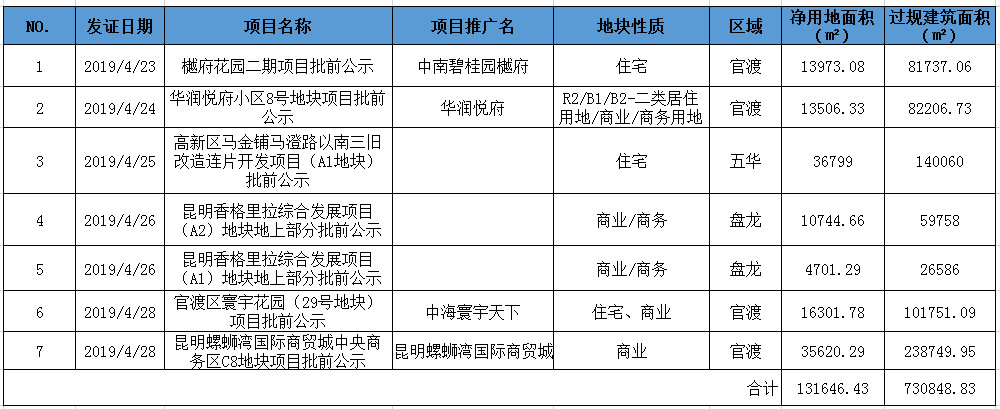 界面楼市昆明根据昆明市规划局公布的建设工程规划许可信息统计,上周昆明有6个项目通过规划审批,过规面积为730848.83㎡,净用地面积合计131646.43㎡。