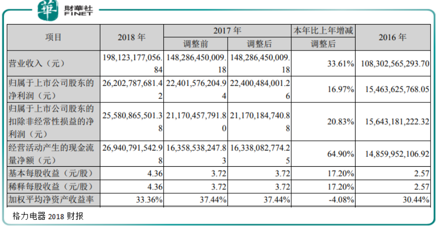 4月28日晚间,格力电器发布2018年年度报告。报告显示,2018年公司实现营业总收入2000.24亿元,同比增长33.33%。实现归属上市公司股东净利润262.03亿元,同比上涨16.97%。在大好业绩面前,董明珠也在内部透漏,希望将2019年营收目标定在2500亿。