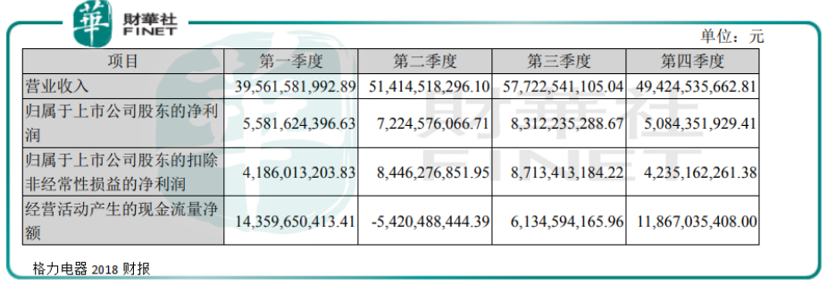 格力电器第4季度归母净利润只有50.8亿,在营收同比增长120亿元的情况下,净利润却同比减少18.56亿元。