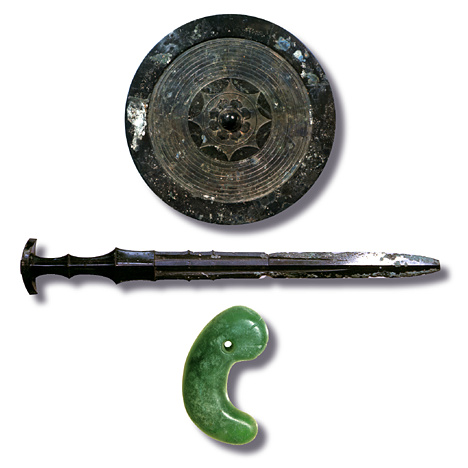 草薙剑又名天丛云剑,代表天皇的勇气。传说中素戋呜尊砍掉了八岐大蛇的尾巴砍掉,从而获得草薙剑。后来为修补与姐姐天照大神的关系,素戋呜尊又把剑献给了后者。