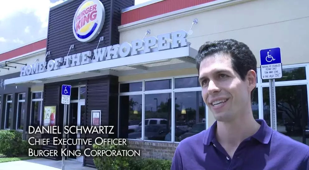 五爸是叫施瓦茨,是汉堡王第21位CEO,他上任两天,就为汉堡王清洗了15个卫生间,在免下车窗口招待客人,还学会了在35秒内做一个皇堡,汉堡王第一次感觉自己,还能被当作亲生儿子一样养。