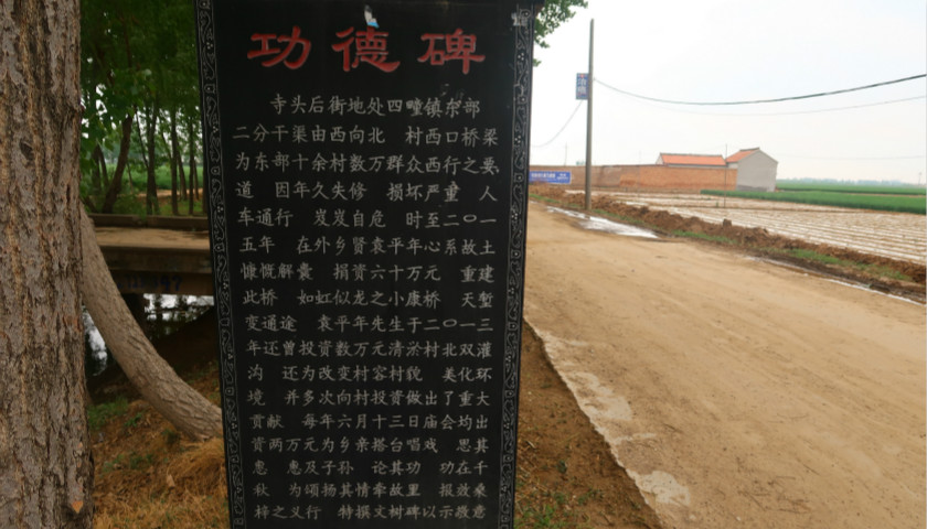 寺头后街村委会2016年所立的功德碑则写道,“二〇一五年,在外乡贤袁平年心系故土,慷慨解囊,捐资六十万元重建此桥(寺头西桥),如虹似龙之小康桥。”并称,“论其功,功在千秋”。