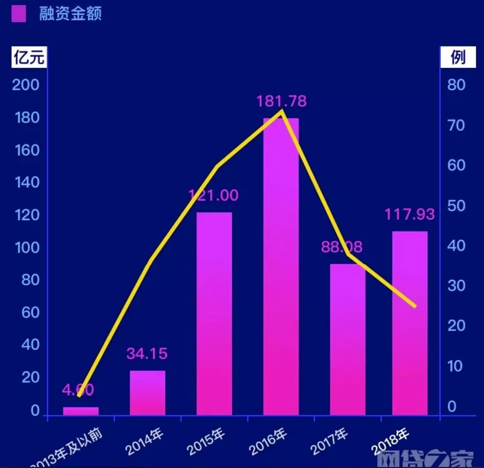 网贷之家数据显示,2013年之前,P2P网贷行业整体融资金额为4.6亿元,到2014年便达到34.15亿元,2015年涨至121亿元,2016年达到历史新高——181.78亿元。