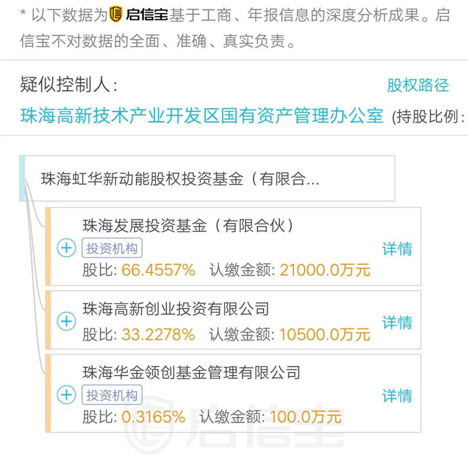 新的投资者珠海虹华新动能股权投资基金的有三个股东组成,分别是珠海发展投资基金,珠海高新创业投资有限公司,珠海华金领创基金管理有限公司,其疑似控制人为珠海高新技术产业开发区国有资产管理办公室。