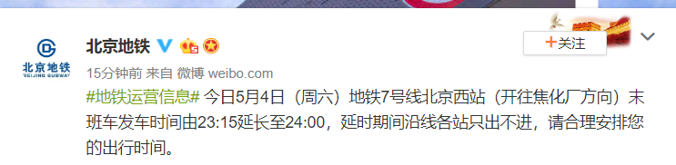 据北京地铁消息,今日5月4日(周六)地铁7号线北京西站(开往焦化厂方向)末班车发车时间由23:15延长至24:00,延时期间沿线各站只出不进。