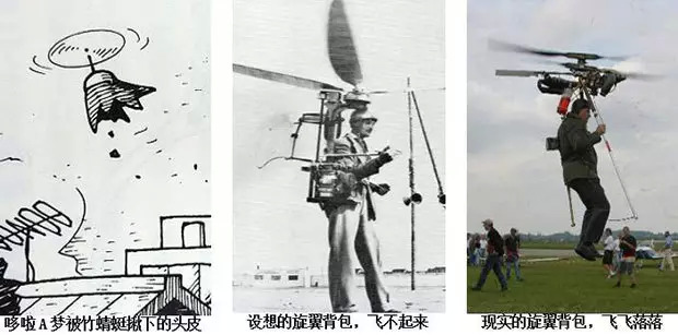 背包直升机与喷气背包的区别,顾名思义,在于它不用喷嘴喷气,而用旋转的桨叶。当然,也得缚在背上——像哆啦A梦那样固定在头顶,一启动,就只有一块头皮从空中飘过了。