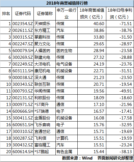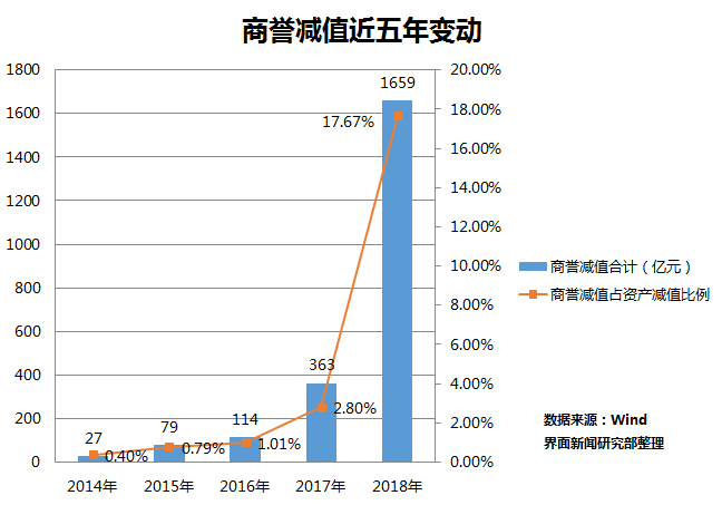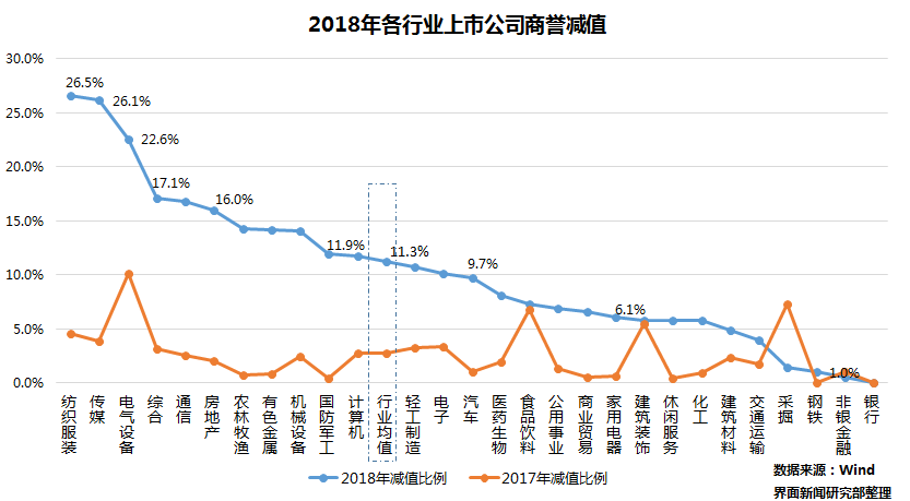 从金额上来说,传媒、计算机、医药生物三个行业的减值总额最高,分别为481亿、135亿及130亿,合计占到了总减值金额的45.03%。其中纺织服装行业的商誉减值占原商誉比例最高,达到26.5%,而去年这一数字仅为4.6%。行业商誉减值比例由2017年的2.7%增长到2018年的11.3%。