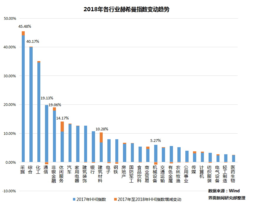 市场集中度最高的行业为采掘行业,HHI数值为0.4548。HHI涨幅最明显的行业为休闲服务、建筑材料,指数分别上涨0.035与0.034。由于房地产业营业收入存在滞后性,所以房地产业集中度指数虽呈现上涨,但上涨幅度不大。机械设备行业集中度下滑幅度最大,为-0.0079。