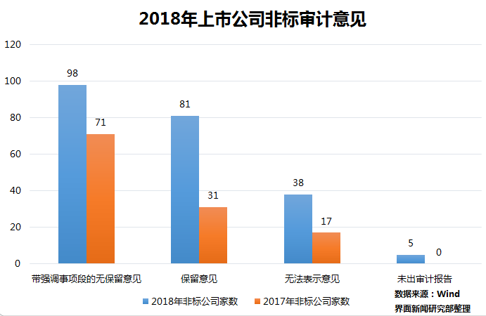 2018年共有217家上市公司被给予非标意见,相较去年的119家,增幅达到82%。如果算上尚未披露年报或季报的5家上市公司,这一数字会进一步增多。其中有83家连续两年被给出非标意见。