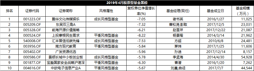综合得分垫底的是鹏华文化传媒娱乐(001223),值得一提的是,该基金曾在2月份夺得股票型基金综合得分第二位。彼时传媒板块月涨幅达30%,但成也萧何败也萧何,4月传媒板块止步月K两连阳,板块跌幅达7.64%,受此影响,该基金跟随下跌7.05%。