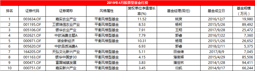 综合得分第一位的是嘉实发展农业(003634),该基金4月净值增长率为11.52%,收益排名居首,主要得益于基金经理出色的选股能力。伴随着新一轮猪周期的开启,猪肉股已然成为A股最强板块。作为农业主题基金,该基金重仓了温氏股份(300498.SZ)、新希望(000876.SZ)、双汇发展(000895.SZ)等多只猪概念股,其中,新希望上月累计涨幅高达30.15%,双汇发展亦上涨7.66%,受益于此,基金也因此收益颇丰。