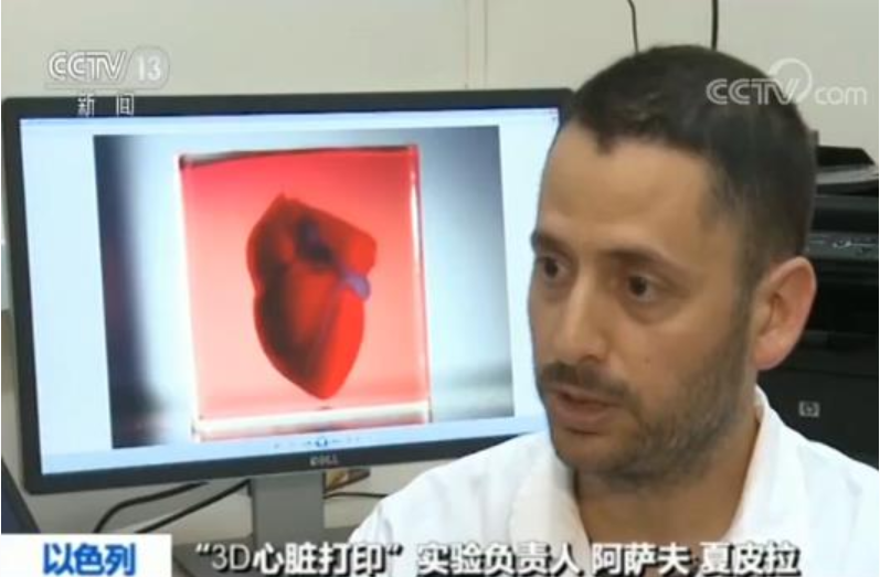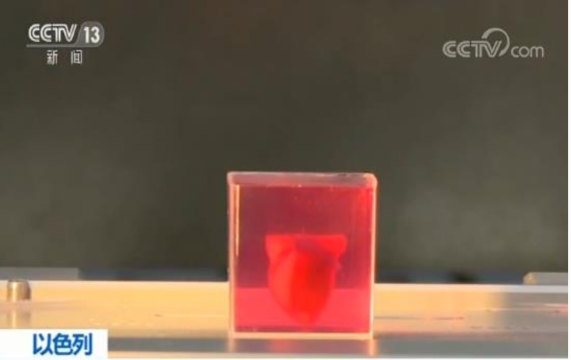 记者 赵兵:“这个无论从大小还是外形上都像是一个小樱桃的,就是这回以色列科学家通过3D打印技术制作出来的一个所谓完整的人类心脏。虽然它的直径 它的长度不到两厘米,但是大家也不要小看,因为它的结构是跟人类心脏的结构完全一样的,上面蓝色的部分是血管,包括它里面还有心室和心房,更重要的是它的原始细胞是从患者身上直接提取的,这也给未来这种器官移植可能带来的排异反应提前进行了排除。”