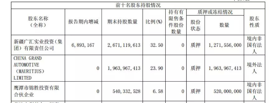 股东方面,截止2018年12月21日,公司前三大股东合计持有公司股份51.75亿股,其中处于质押状态的股份约37.56亿股,占其合计持股的72.56%。其中,公司第一大股东暨实控人广汇集团股份质押比例约达47.6%。
