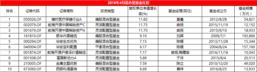 过去一个月,A股市场降温明显,由此更考验基金经理的择时和选股能力。根据Wind数据统计,2019年4月全市场存续混合型基金共有3009只,月平均收益率为-0.72%。