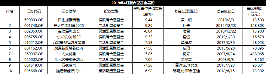 可以看出,4月份业绩表现不佳的均为偏股混合型和灵活配置型基金。其中,综合得分垫底是民生加银精选(690003),上月净值下跌9.44%。自今年3月29日开始该基金由黄一明独自管理。在一季报中,基金经理表示看好科创板带来的投资机会。梳理其十大重仓股可以发现,该基金重仓了上海新阳(300236.SZ)、鲁信创投(600783.SH)、大众公用(600635.SH)等多只创投概念股,但4月份上述个股跌幅均超10%。