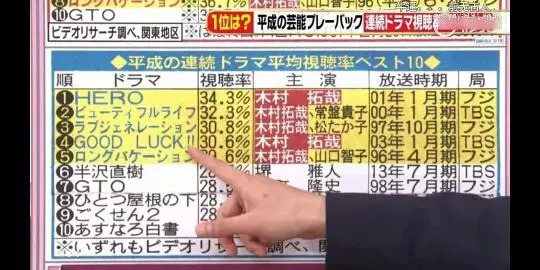 至今日剧收视排行榜上TOP 10 的电视剧,有6部都是木村拓栽主演,并且包揽了前5名。