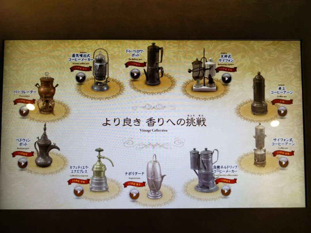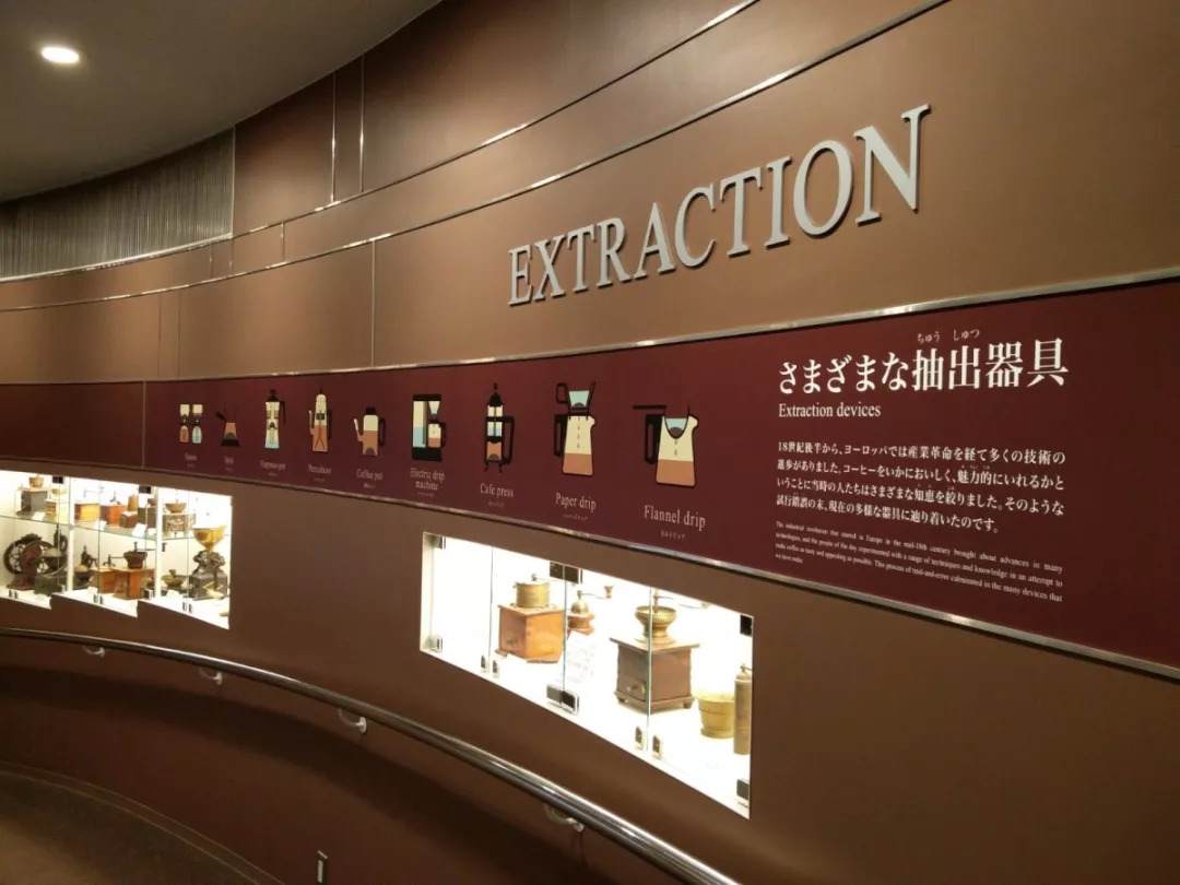 在「萃取」展厅里可以看到各个时代的咖啡萃取器具,以及从家庭美味咖啡的冲泡方法到咖啡馆的别致咖啡等各种美味咖啡的信息。