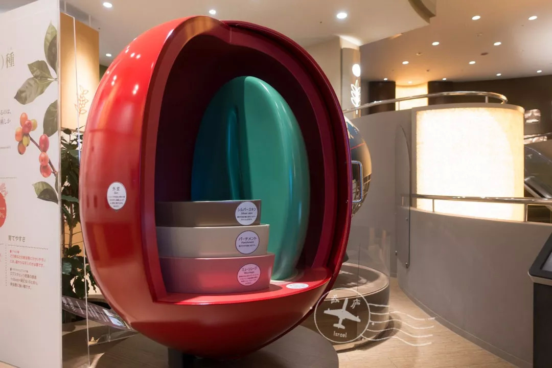大厅中央有一个巨大的红色咖啡浆果(coffee cherry)模型,从果皮(外果皮)、果肉(中果皮)、果胶及带壳豆一层一层剖析咖啡浆果的原始样貌呢!