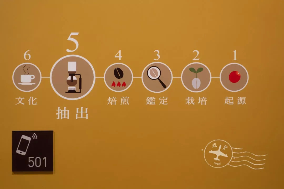 展览共分六大板块,包括咖啡的起源、种植、鉴定、烘焙、萃取、文化。设计者希望透过「看」,「听」,「闻」,「触摸」,「品尝」等五感,带你了解咖啡的不同面貌。