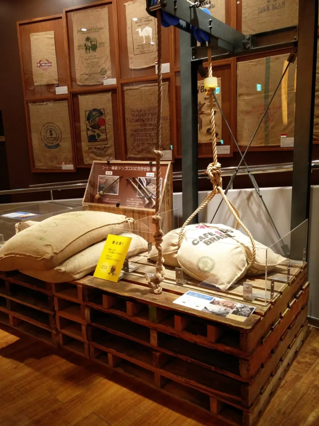 时至今日,麻袋依然是咖啡生豆的主要包装形式。在咖啡「鉴定」展区可以看到许多国家咖啡麻袋,围拢成一条长廊,十分壮观。
