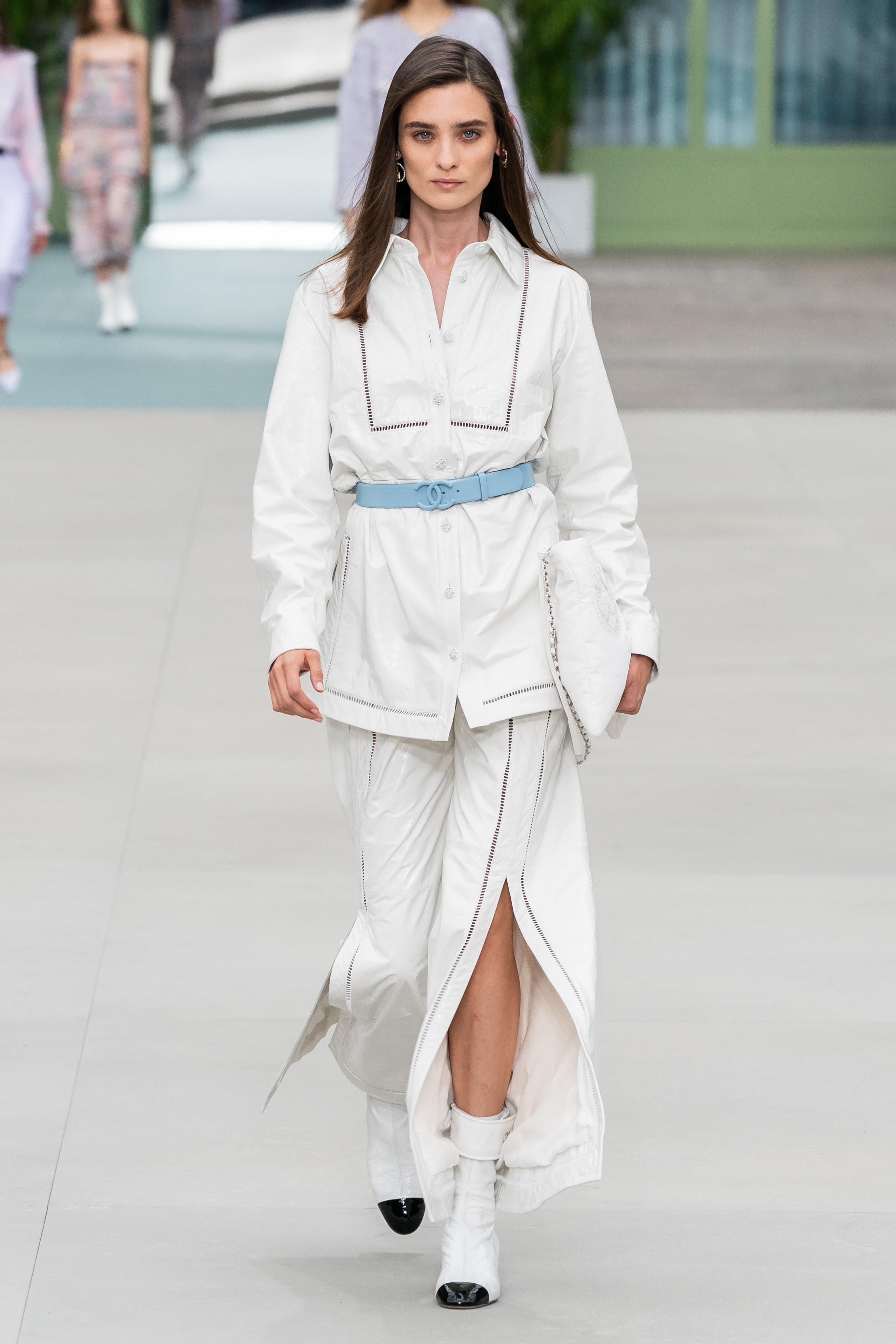 不少时装评论人注意到,大秀的前几个造型就有阔腿裤,它们为整个发布确立了相对舒适的基调。随后人们才发现,阔腿裤不只是在开头出现,它们在整场大秀中都有着很高的出场率,甚至还有开叉版本和皮革版本。