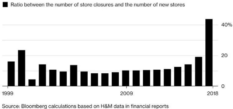在门店扩张方面:2017年8月,GAP集团退出澳大利亚市场,并宣布未来3年将关闭200家实体店;2018年英国快时尚品牌NEW LOOK业绩急剧恶化,营收双跌,关闭了中国地区的130家门店;快时尚品牌Topshop先后推出了日本市场、澳大利亚市场和中国市场,其母公司Arcadia 在2018年11月释出计划关闭英国三分之一实体门店的消息。