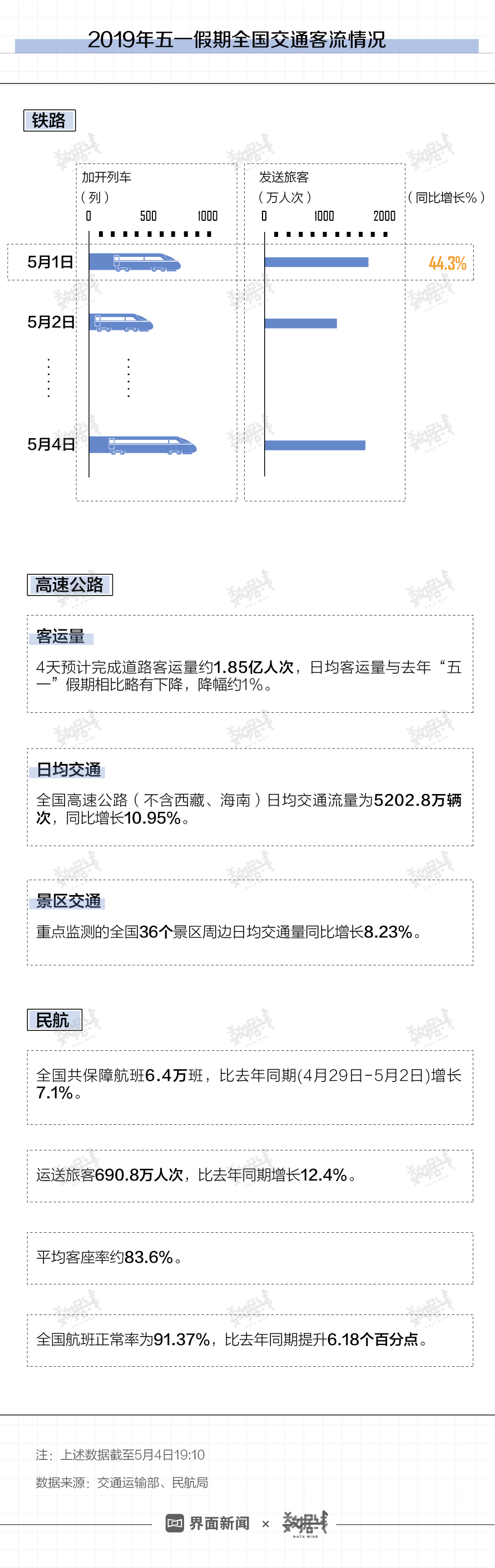 据交通部数据,2019年5月1日,铁路发送旅客共计1724.3万人次,同比增长达44.3%,创铁路单日旅客发送量历史新高。