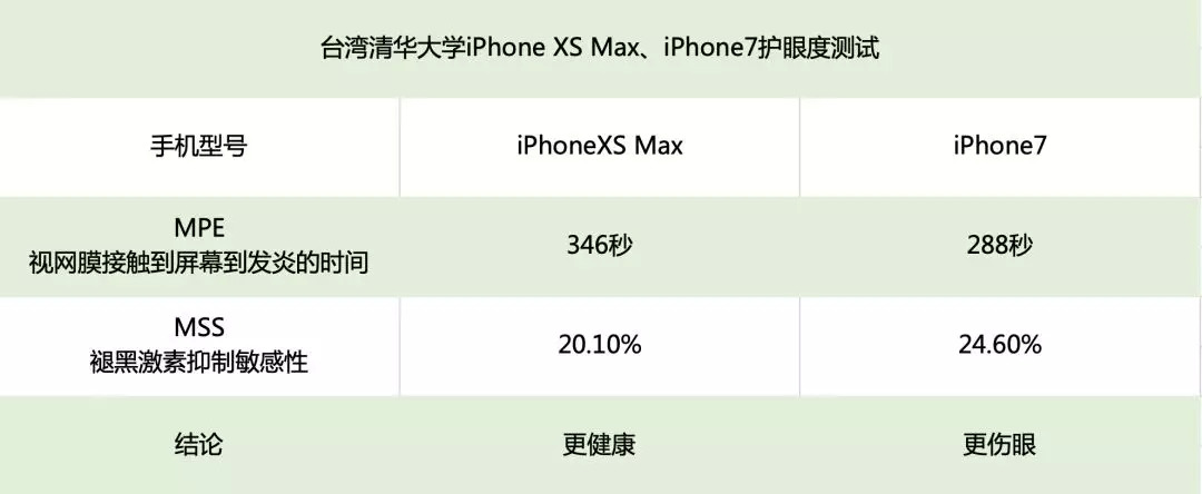2018年10月,来自于台湾清华大学的一则研究表明,苹果最新推出的iPhone XS、XS Max的OLED显示屏比之前iPhone机型上的液晶显示屏更健康。