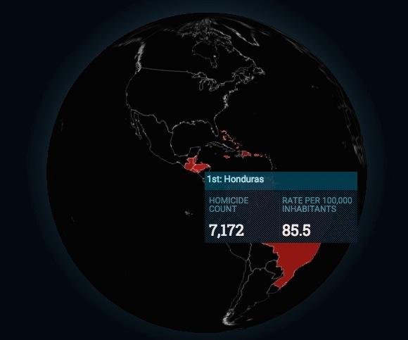 位于拉丁美洲的洪都拉斯是世界上最危险的国家。2012年这里共发生了7172起凶杀案,平均每10万人中有85.5人死于谋杀,而世界平均值是6.2人。