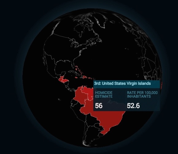 而美属维尔京群岛高居第三位。虽然自2010年至2012年仅有56人被杀,不过平均下来,每10万人中于谋杀的人数多达52.6人。