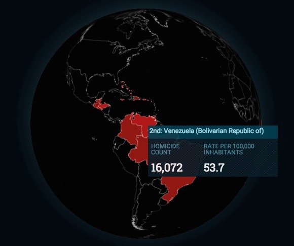 委内瑞拉次之,平均每10万人中有53.7人死于谋杀。