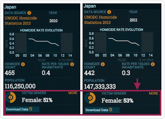 虽然日本的谋杀率很低,不过去日本的女同胞们需要当心了,因为相较于全世界高达80%左右的受害者都是男性,日本受害者则是男女参半,不相上下,近几年女性受害者的比例更有逐年增加的趋势。