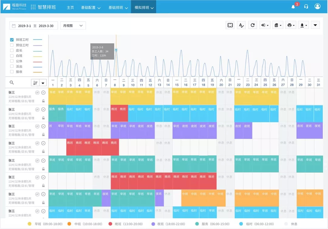 某家餐饮企业店内有8个员工,按照每人工作8小时计算,手工排班总共需要64个工时,但某些工时是可以错开波峰波谷进行灵活调整,通过喔趣科技排班系统优化后只需要47个工时,节省出两名员工的全日工时。