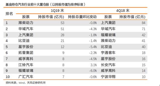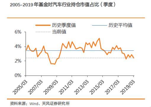 天风证券研究报告显示,“基金对汽车板块持仓占比,已经连续5个季度低于3%并低于2005年以来历史平均的3.5%。”2019年第一季度,基金们开始了新一轮减持行动。2018年第一季度持仓占比为2.3%,2018年第四季度回升至2.9%,但2019年第一季度持仓占比跌回2.4%。