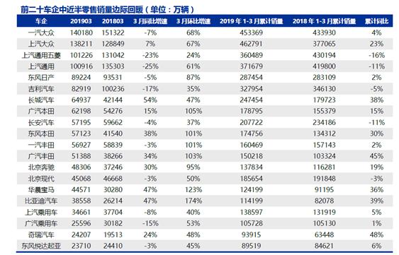 《上海汽车报》发现,和2018年四季度相比,企业的赚钱能力增强了。2019年第一季度,只有4家扣非后净利润环比下降。多位车企高层表示,这主要是因为去库存、减产。中国汽车工业协会的数据显示: 3 月,批发销量跌幅大幅收窄,有消费景气度回升迹象。全国汽车批发总销量252 万辆,同比降幅由1-2 月的(下降)15.0%大幅收窄至(下降)5.2%。其中,狭义乘用车3 月批发销量为197 万辆,较去年同期下滑7.4%,同比降幅较2月缩减10个百分点。20家车企中,3月零售量较2月全线回升。