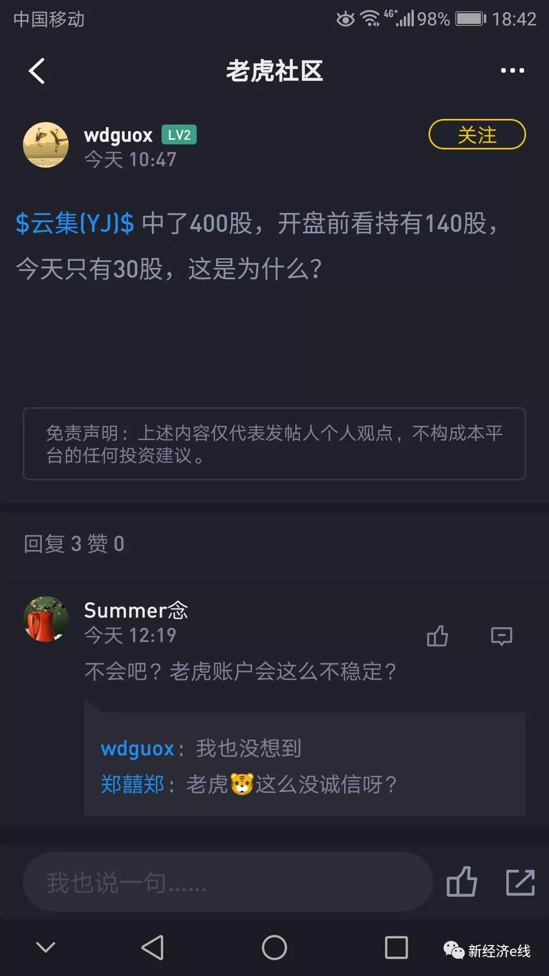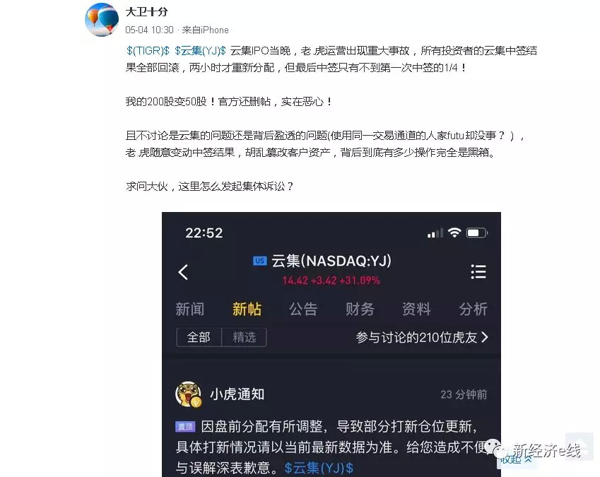 5月4日,有网友“大卫十分”也在雪球发贴称,“云集IPO当晚,老虎运营出现重大事故,所有投资者的云集中签结果全部回滚,两小时才重新分配,但最后中签只有不到第一次中签的1/4!我的200股变50股!官方还删帖,实在恶心!且不讨论是云集的问题还是背后盈透的问题(使用同一交易通道的人家futu却没事?),老虎随意变动中签结果,胡乱篡改客户资产,背后到底有多少操作完全是黑箱。求问大伙,这里怎么发起集体诉讼?”