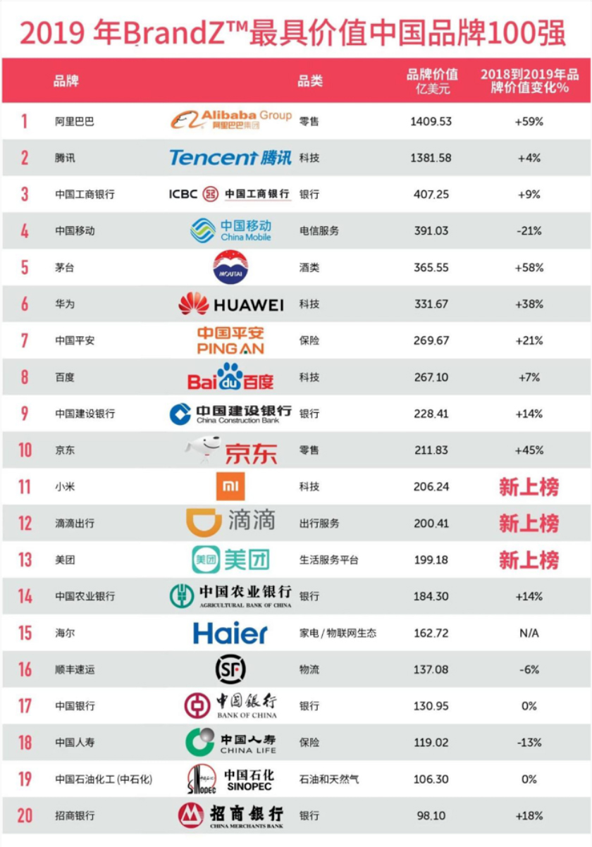 2019年5月6日,“BrandZ™ 2019年最具价值中国品牌100强”榜单在北京发布。与往年相比,今年的榜单除了100强品牌总价值同比大幅增长以外,还有一个重要的趋势性创新值得学术界和企业界高度关注:榜单的品类选项中增加了“平台”和“生态”两个新品类。美团、大众点评和饿了么被归于“生活服务平台”,而传统上被认为是家电企业的海尔则被归于“家电/物联网生态”。海尔生态是唯一上榜的物联网生态品牌,品牌价值为162.72亿美元。