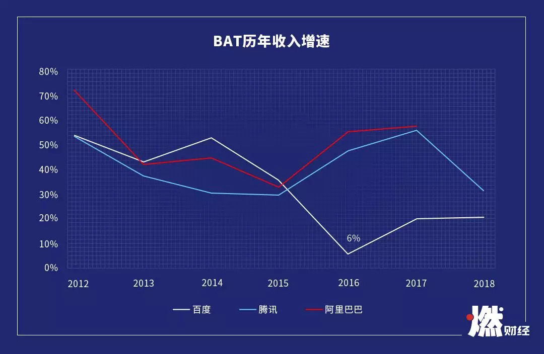 影响直接反映在了财报上,当年,百度的收入增速直降到6%,相比腾讯阿里近50%的增速少得可怜,市值628亿美元,比腾讯阿里低了三个身位,彻底掉队。之前一直为百度带来95%以上营收的竞价排名,终于还给了百度沉重的打击。