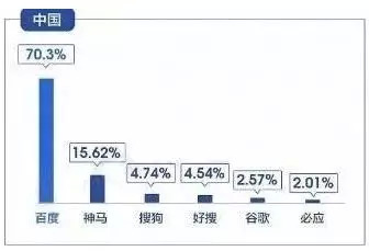 据Statcounter最近发布的中国移动搜索引擎市场份额报告,中国区搜索引擎市场份额排行中,百度独占鳌头,至今仍是国内搜索引擎巨头,市场份额高达70.3%。神马搜索市场份额提升至15.62%,搜狗搜索占4.74%,360搜索(好搜)占4.54%。