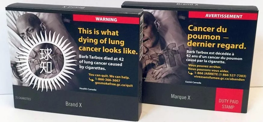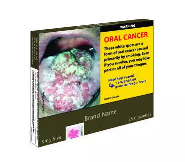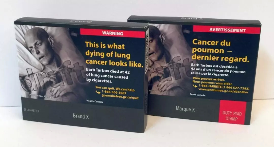 加拿大是第一个引入图片警示的国家,2001年加拿大就对国内的香烟包装做出了规定。规定警示图片需占到盒面包装正反面的一半以上,包装侧面也要出现焦油,尼古丁,一氧化碳,甲醛,氰化氢和苯的排放量。