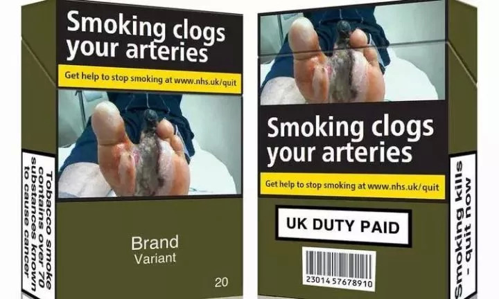 严格控烟的英国也于2016年9月引入了“简易包装”法,取代了之前的标准包装。如今,按照规定,英国厂商的卷烟包装必须用深橄榄绿色的方盒子,盒体 65% 以上面积的必须被文字警告和病变图片覆盖,强调吸烟对健康的负面影响。不得自行采用个性化包装。