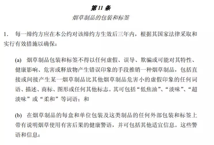 终于,2003年5月21日,在日内瓦召开的第56届世界卫生大会上,《烟草控制框架公约》获得一致通过,是世界卫生组织(WHO)第一个具有国际法约束力的全球性公约,其中也标明了对“普通烟草包装”的规定: