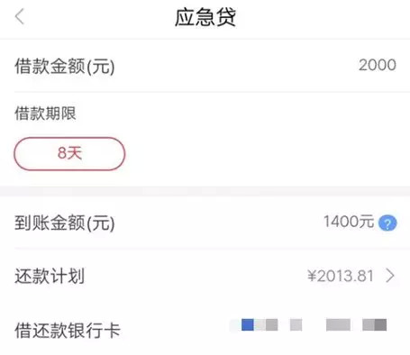 用户张晓雪在大王贷款上找到一款产品“应急贷”,借款2000元,结果只直接到账1400元,砍头息是600元。